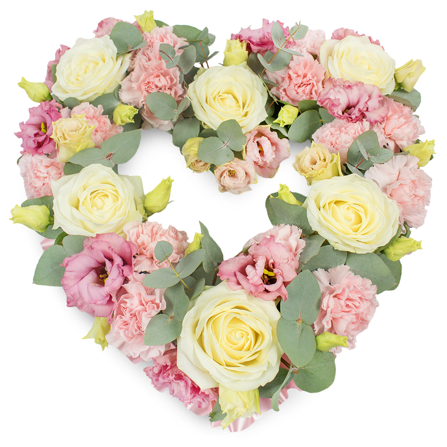 Express your heartfelt emotions with our Delicate Open Heart tribute bouquet. This elegant arrangement features a harmonious blend of white roses, pink carnations, pink lisianthus, and eucalyptus leaves, meticulously arranged to honor your loved one.